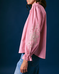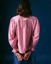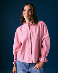 The Carla Cotton Blouse is beautifully crafted in Portugal from pure cotton, woven in a subtle red and cream stripe. This versatile women’s cotton blouse is elevated with thoughtful detailing, a delicate frill collar, softly gathered cuffs, and intricate embroidery along the sleeves.