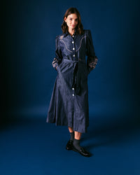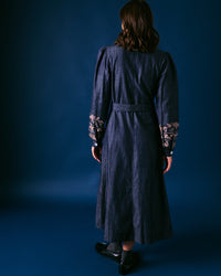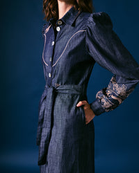 Crafted in a fluid denim, made in Portugal with embroidery detail that invites us to celebrate the change in season; hidden pomegranates, pheasants, blackberries & feathers are just come of the illustrations that feature on the sleeves, collar and front of the dress. Optional tie belt for styling. Button through to hem. Mid calf length. Full hem and subtle puff shoulder.