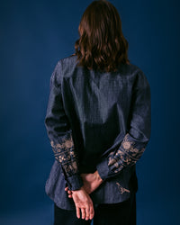 Crafted in a fluid denim, made in Portugal with embroidery detail that invites us to celebrate the change in season; hidden pomegranates, pheasants, blackberries & feathers are just come of the illustrations that feature on the sleeves, collar and front of the shirt. Relaxed oversized boyfriend shirt styling. Curved hem, button through to hem.