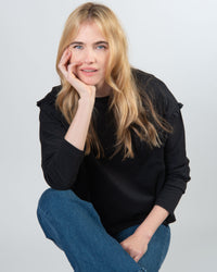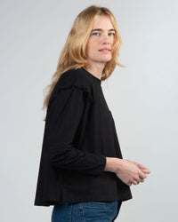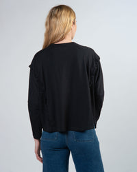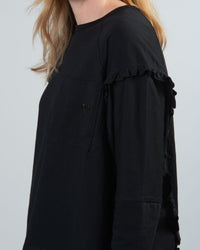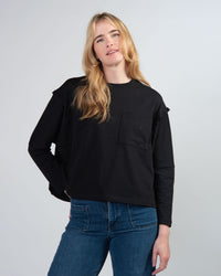 This top is made from soft 100% BCI Cotton in Portugal. It features a relaxed, boxy fit with a crew neck, raglan long sleeves, and a curved back hem. The sleeves have a subtle frill detail, and there's an embroidered logo on the chest pocket. The fabric is a textured slub jersey.