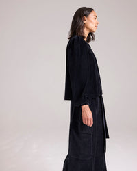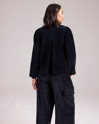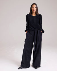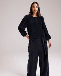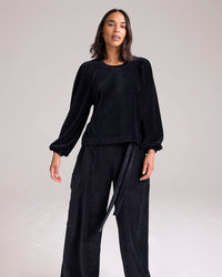 Crafted in Portugal, this sweatshirt is made from plush velour cord. It includes a gentle swing back pleat, understated pleated shoulder detail, cozy crew neck shape, and full bell sleeve detail with an elasticated cuff for simply styling.